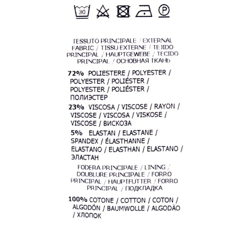 - 72% polyester, 23% viscose, 5% élasthanne